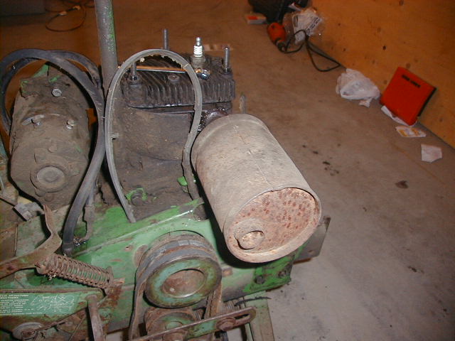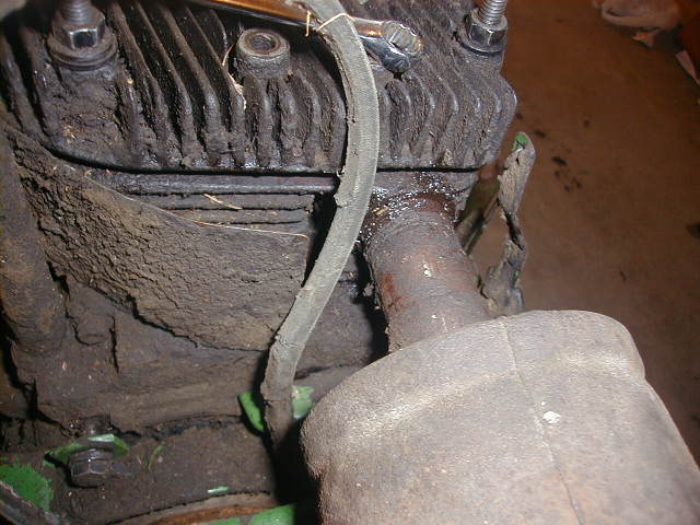 So, this is the muffler on Bror… And I THINK I’m going to need to pull it off, just to be able to tear down the rest of the engine… I dunno, maybe I can leave it on when I go to pull the engine, because I THINK that piece of frame that is riding right underneath the muffler will come off when I lift the engine out… I hope so, because I can’t seem to get the pipe out of the exhaust port… Any suggestions would be welcome… Here’s how its mounted…