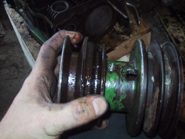 Of course, I left the camera out in the garage, so I don’t have the pictures…  Took me nearly the whole afternoon of soaking with penetrating oil, hammering with the convincing mallet, pulling with the pry bar, and finally I drilled out the shaft key.  Turns out, when I finally got the pulley off, the shaft is slightly torqued at the end, so that the key was jammed up against the pulley.