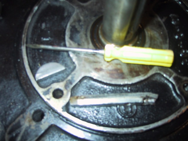 Flipped the engine over (good idea to have put the hole in the top of the engine stand, huh?), tried the big punch on the pulley key… No luck… However, on closer inspection I could see that there was a hairline space between the keyway and the key where I’d drilled away a lot of the key… So, grabbed the tiny screwdriver and my little hammer…