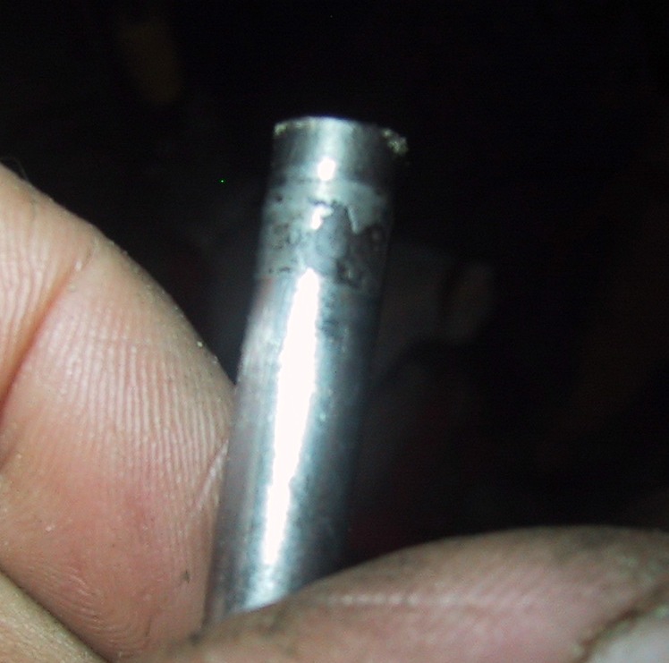 So, then I pulled the tappets… Exhaust tappet looked absolutely pristine and shiny, once I wiped the oil off it…. Intake tappet, however, had this, right where (I think) it sat within the guide….