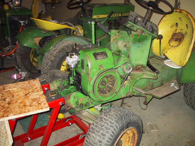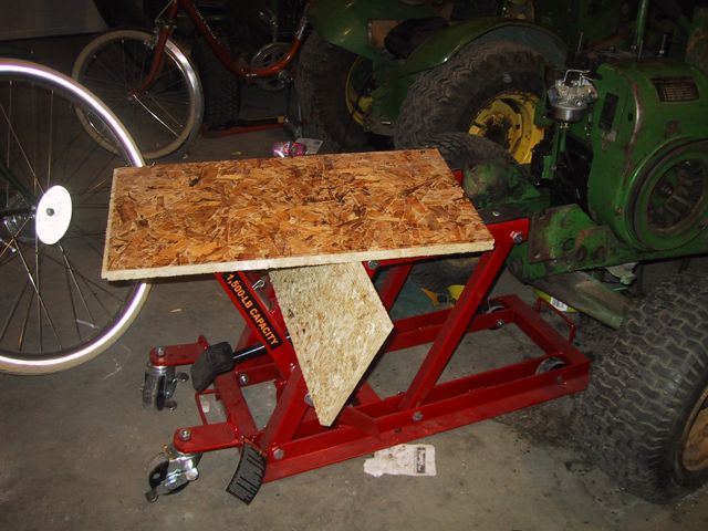 I KNEW there was a good reason I bought this! Since I couldn’t LIFT the bloody engine with the flywheel and generator on it, the motorcycle lift and a couple of boards for sliding the motor along worked SLICK…