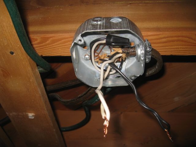The old fixture on its way down… Notice the box mounted on the surface of the joist, and the wire running along the surface of the joist…