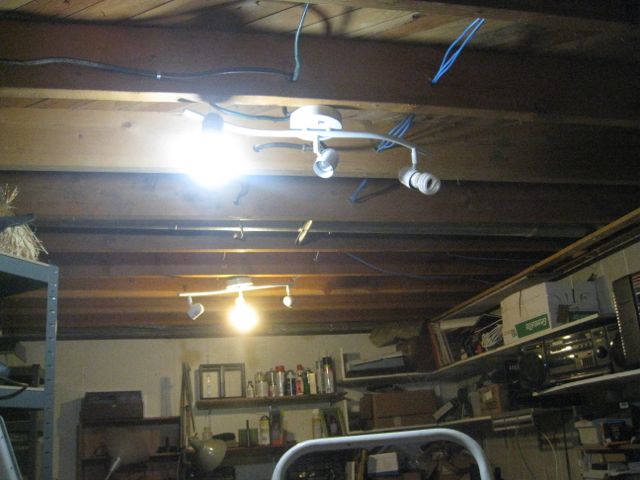 So, off came the panelling where the existing switch was, then nailed down where all my tools were that I needed BEFORE I turned off the breaker… Off with the breaker.. Disconnect the first fixture and pull the wiring back… Well, while I’m doing that, might as well take the rest of the strapping that the wiring was hooked to down, DOH can’t find the wrecking bar in the dark! Finally find it in the bin-o-many tools, 20 minutes beating up on some old strapping. Well, then, you know, I wanna do this move right, so I should really run the wiring through the joists, not surface mounted on the joists like it WAS. So I pull out the big drill and the 1″ spade bit and drill 7 new holes… DANG this old growth Douglas Fir they built my house outta is HARD… Mount the boxes, re-run the wire, break for supper… LTGal says, are you ready to go live yet? Anything you need help with? Well, she COULD pull down the fixture outta the laundry room that she wants me to swap into my space… Okay… Then she comes to help me put up the fixtures, ’cause she’s better on ladders than I am… DOH, I mounted the boxes recessed, and the fixtures require them to be out a half an inch… Down come the boxes, find two other octagonals that have the mount points appropriate for these fixtures… Up go the new boxes… Good thing I wrote down how the wiring went by this point… Just staple up the wire to where I gotta feed the switch down through the wall, we’re gonna leave that for another day, ’cause the two of us AND LTBabe working on electrical is a lotta work…