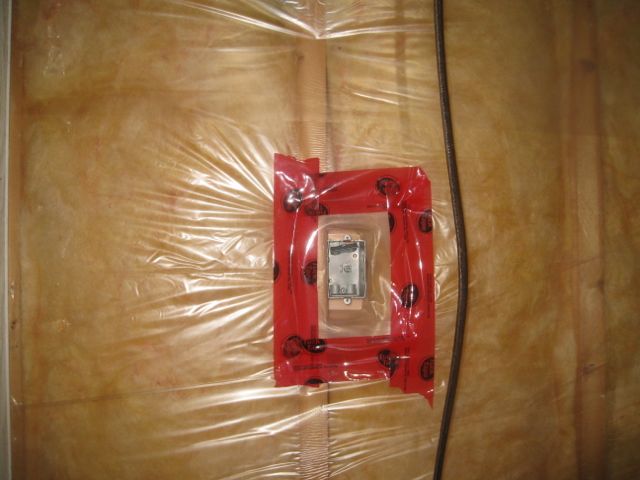 The box mounted, the vapor barrier all nicely tuck-taped, I EVEN got one of those nice hoodie pieces they say to put around your boxes so that it ties into the vapor barrier nicely!