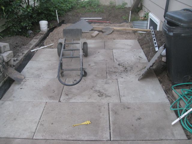 So, three more rows of pavers… Its been a big job, because I’ve been relocating the 24×30’s from out in front of our house, where they’ve been collecting weeds and dirt for the past 10 years out by the street… So not only do I have to lay them down in the back, I have to excavate them from the front and horf them all the way around to the back. Thank goodness for wheelers!