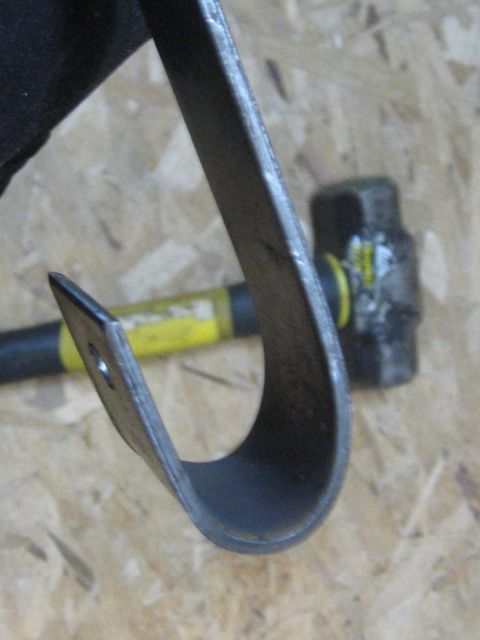 Not totally perfect, but I’m getting the hang of it.  The plan is, I need to bend BOTH ends of the 4′ bar, THEN cut it in half, then bend the OTHER end of each half and drill the holes, THEN cut each of THOSE guys in half so I wind up with 4 hangars shaped like this one…  Then I drill 2 holes in the other end of each hangar for mounting them on the doors…